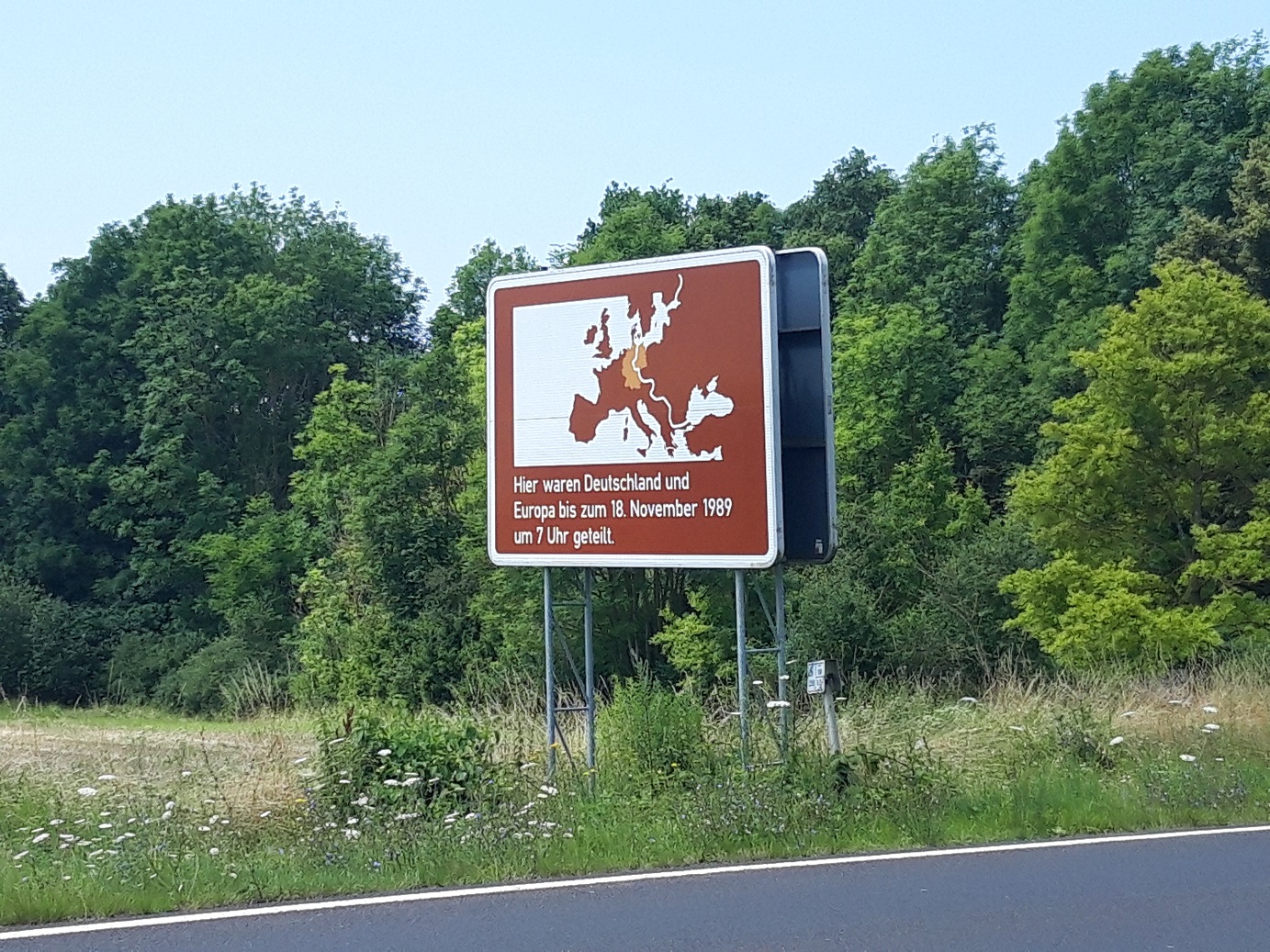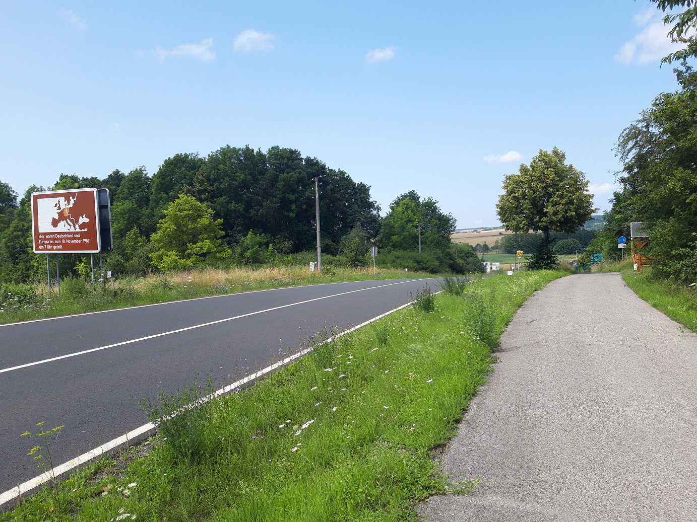Habe also die Landesgrenze Bayerns passiert und festgestellt, dass auch hier noch ein Schild auf die ehemalige DDR-Grenze hinweist (s. pics). In Thüringen nun also angekommen stellte ich prompt fest, dass es hier lange Strecken gefühlt endlos hoch geht. Dazu kommt, dass ich lange auf einer Bundesstraße fahren muss (aufgrund gr. Umwege für Alternativstrecken). Die Autos rasen also auch gern mal mit 120 Sachen neben mir vorbei, da ich auf der Straße fahren muss.