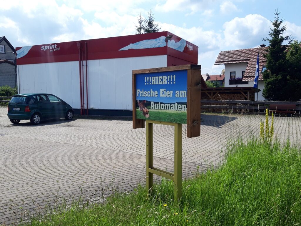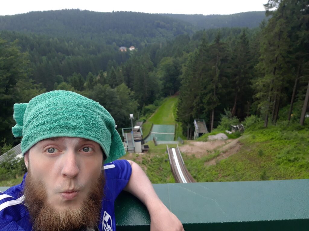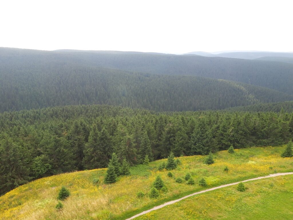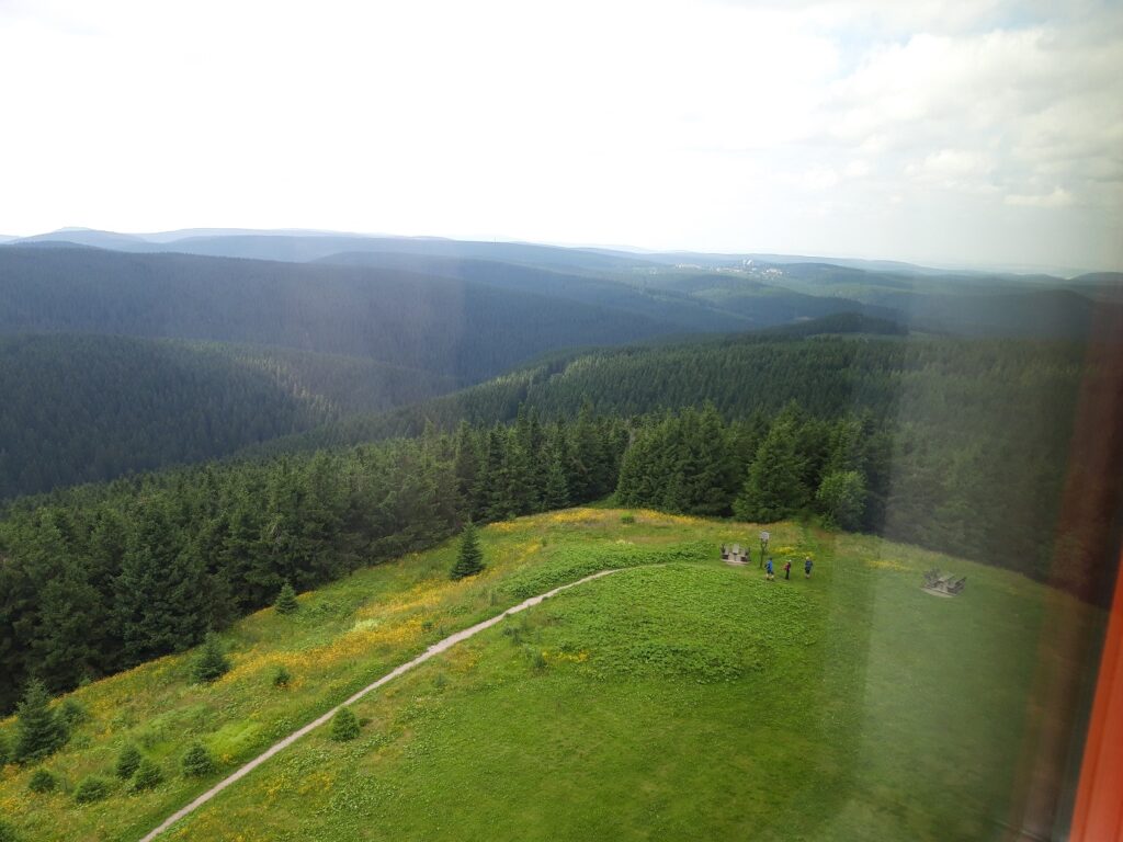 Auf dem Weg zu meinem Zielort fand ich ein Türmchen im Wald. Es stellte sich raus, dass dieser der höchste Punkt Thüringens ist! Für mich unglaubliche 1000m über NN!!! Ich ging die Leiter des Gebäudes hoch – dachte ich würde beim Mond herauskommen – doch fand mich oben mit einem Blick über Thüringen wieder, der echt hammer war (s. Pics).