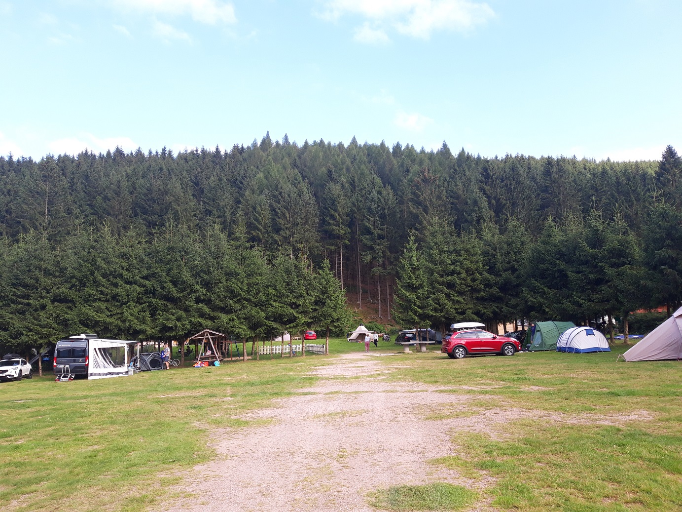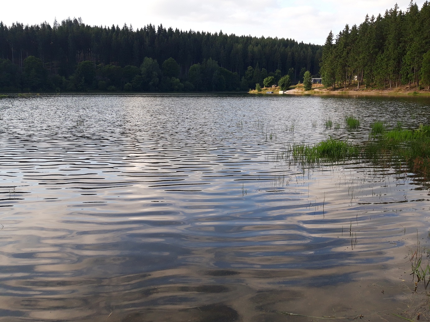 Zuletzt musste ich wieder ne ganze Weile Landstraße fahren, den Windzug der vorbeizischenden LKWs standhalten, doch so erreichte ich dann tatsächlich noch mein Ziel für den heutigen Tag: Oberhof. Der Campingplatz selbst liegt ganz unten direkt am See, was zum einen zwar cool ist, zum anderen aber morgen ne hlb h Bergauffahrt auf Kieselboden bedeutet. Insgesamt war ich heute in 6h 40km gefahren.