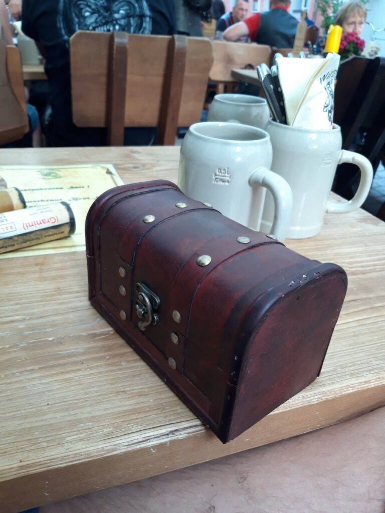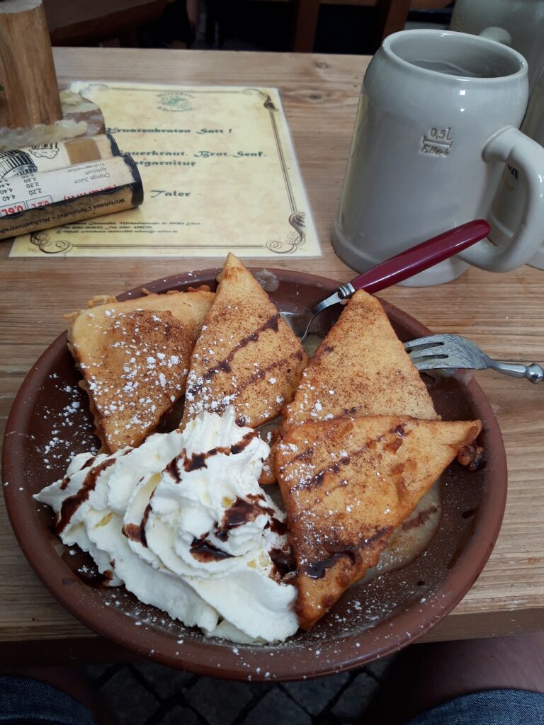 Anschließend war ich im Wirtshaus Christoffel – lt. eigener Auskunft das älteste in Erfurt. Und diesen Laden kann ich wärmstes empfehlen. Mehr als dort kann man sich glaub ich nicht im Mittelalter fühlen. Ich habe dort die besten (wenn auch zugegegebenermaßen meine bislang einzigen) Thüringer Rostbratenwürste gegessen (s. Pic). Anschließend selbstgemachte Arme Ritter mit Apfelmus und Schlagsahne – 1A. Auch die Anrede des Kellners war top. Von “Wisst ihr schon den Trank” oder “Und was zum Mahl” über “So sei es” bis hin zu “so zieht von dannen” kam alles original rüber – mega gut. Der Mechaniker von der Fahrradwerkstatt hatte da seine Hochzeit gefeiert – jetzt weiß ich warum. Toller Laden! Auch das Bier, sowie das Kellerbier im Krug ist empfehlenswert. Wobei ich das erste fast leer hatte und seit morgens nichts mehr aß, was zur Folge hatte, dass bei mir nach den 2x 0.6l (Krug Maß) Bierchen schon ein Lämpchen an war.