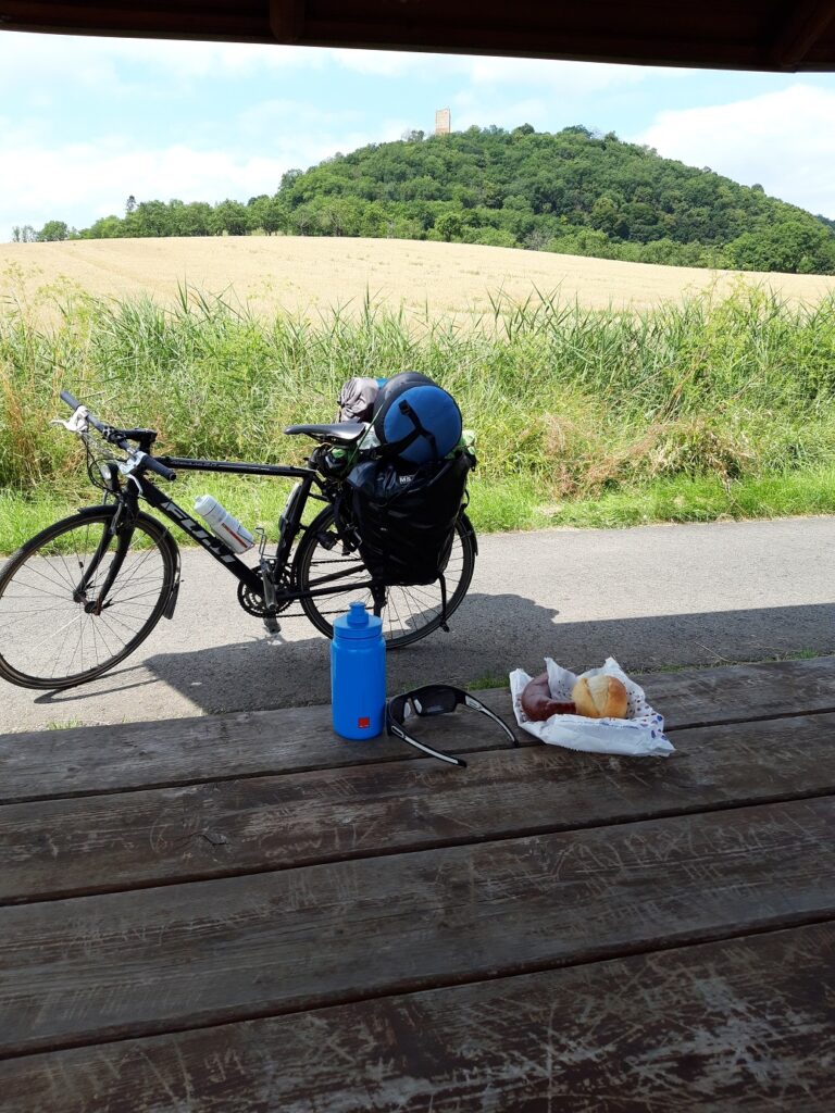 Ich holte mir im nächsten Kaff (Mühlberg) in der örtlichen Schlachterei ne leckere grobe Mettwurst aus eigener Schlachtung und 1 Brötchen und vertilgte es auf einer Bank neben einer Schloßruine (s. Pic) – entspanntes Frühstück. Die Verkäuferin riet mir nicht zulange in Thüringen zu bleiben, sondern bald das Weite zu suchen, da es in den nächsten Tagen ziemlich schütten soll in Thüringen – das werde ich beherzigen.