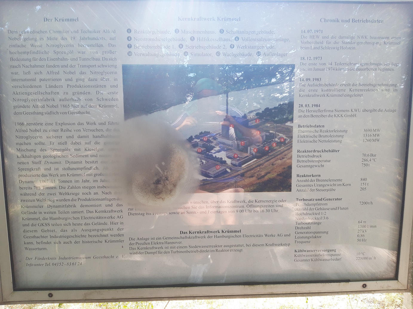 Danach ab Richtung Westen nach Geesthacht. Bestimmt 10 km an der Hauptstraße entlang, bis ich den Wegweiser von Krümmel entdeckte. Da gabs doch Strom! Also rein in das Gebiet. Erst fand ich das riesige Umspannwerk mitten im kl. Wald und dann auch schon das Atomkraftwerk, welches ich dann auch eingehend von außen besichtigte (s. Pics). Kleiner Funfact: Auf dem Gelände wurde der Nobelpreis in gewisser Weise erfunden. Alfred Nobel entdeckte das Dynamit und hatte hier eine Fabrik zur Herstellung errichtet, mit der er sein erstes Vermögen schuf. Am Ende war dies der Grundstock für die Nobelpreis-Stiftung. Auf dem Geländer sind immer noch paar alte Ruinen zu finden, obwohl die Fabrik auch mal explodiert ist (war klar).